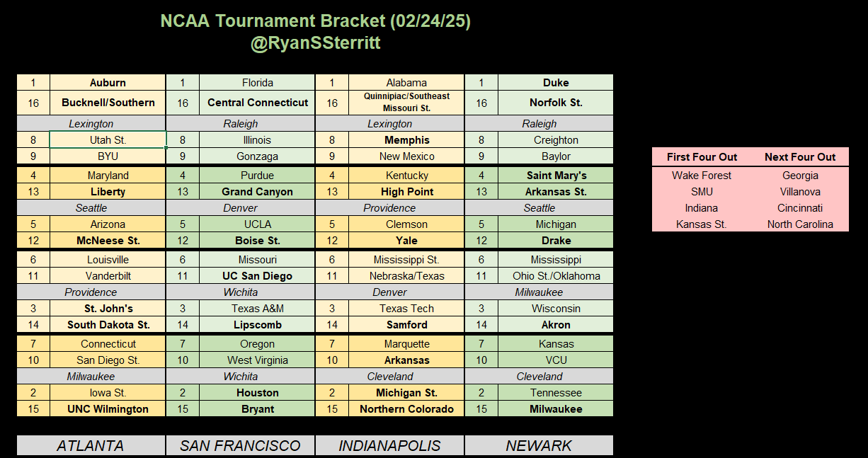 While this may be as strong of a 1-seed line as we’ve seen in a long time, the 8/9 line looks like it will have some elite talent as well. Gonzaga, a top 10-12 team in almost every quality metric, can’t build any sort of resume and will likely end up there. Illinois has struggled massively of late, but they were a solid 2/3 seed as recently as January. Creighton may have a first team all-american at center in Ryan Kalkbrenner, and Memphis has the best resume of any mid-major not named St. Mary’s. Each of these teams has obvious warts, but I would be careful about penciling in all four 1-seeds for the second weekend.